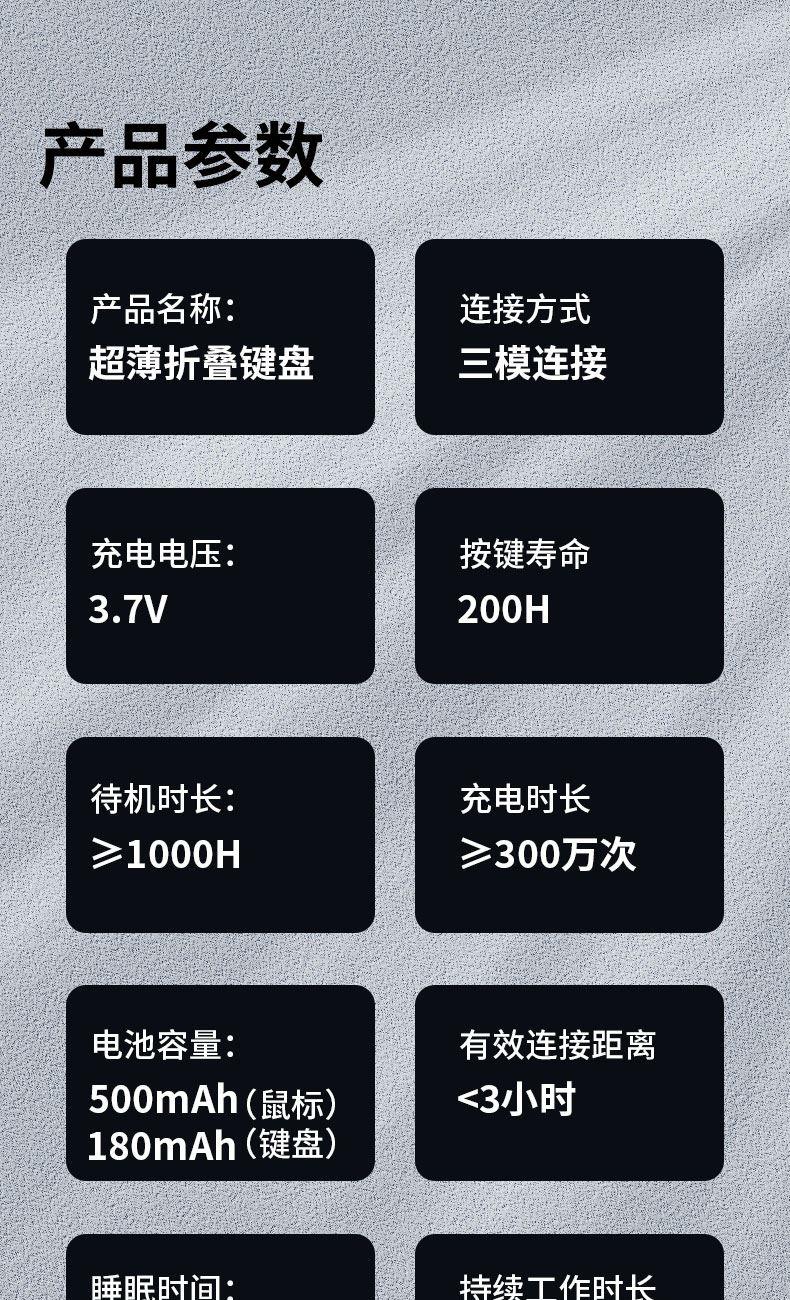 【產(chǎn)品配置】折疊鍵盤鼠標(biāo) (原廠包裝) 【產(chǎn)品型號(hào)】折疊鍵盤-01 【產(chǎn)品顏色】黑色 灰色 銀色 【定制工藝】印刷、雕刻 【包裝尺寸】25*12.5*3cm